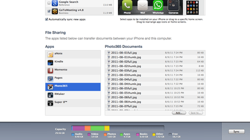 First connect your iPhone to iTunes and sync it. When you connect your iPhone to iTunes go to the Apps tab. Scroll to the bottom, below the list of apps, and you will see “File Sharing”. Look for Photo 365 there in the left box. Make sure you have synced your phone first so all current photos will save to iTunes.